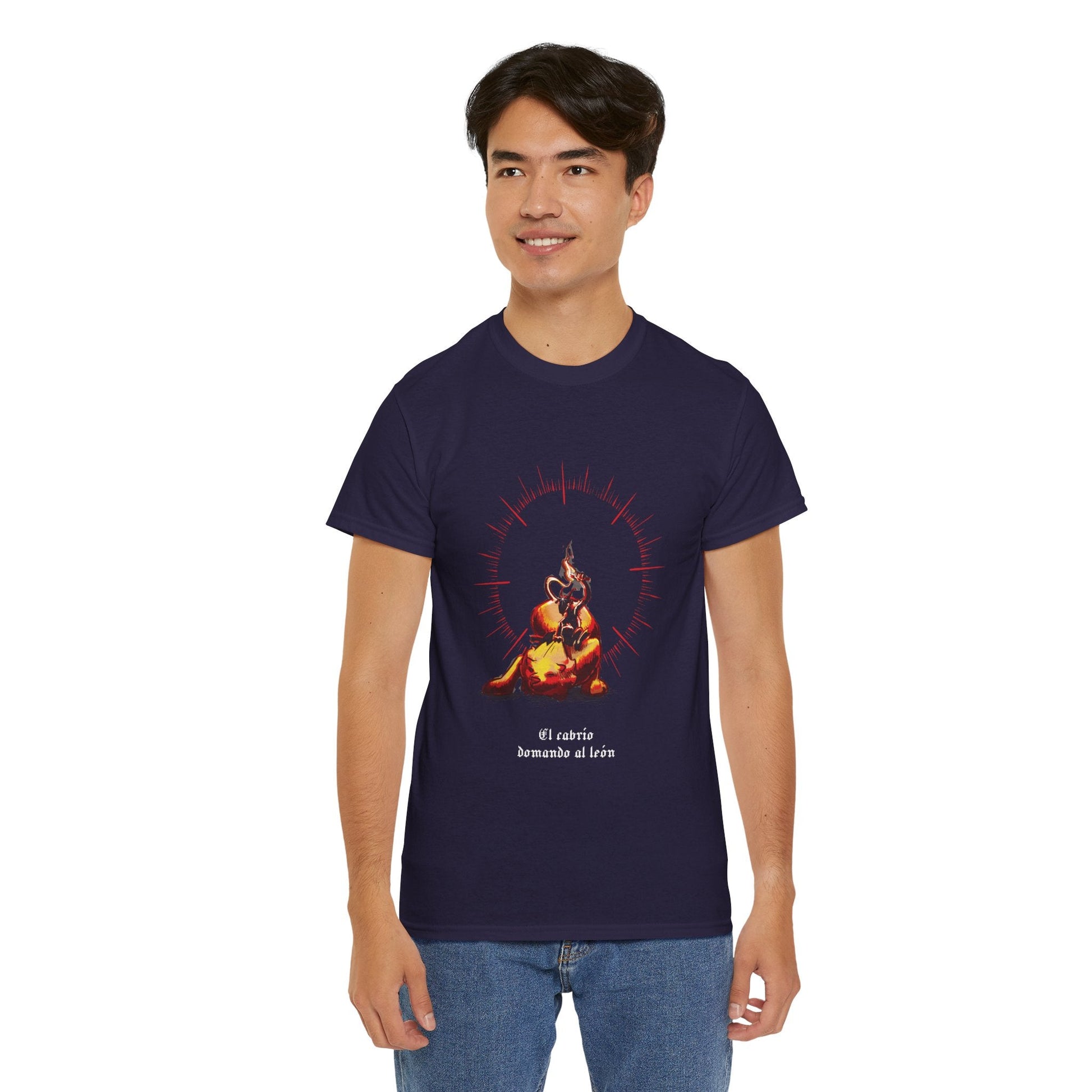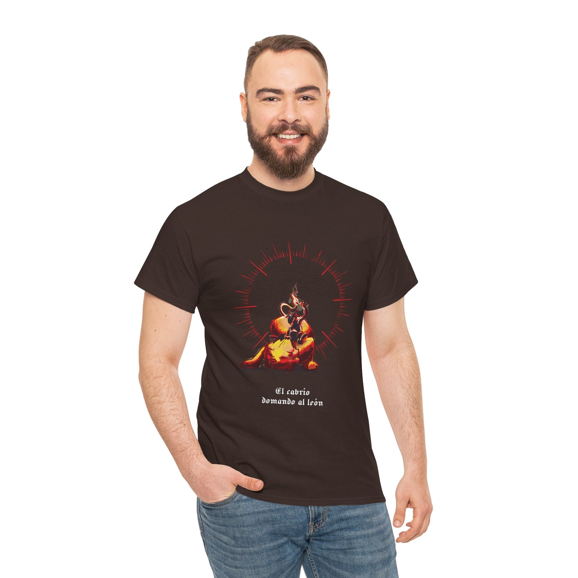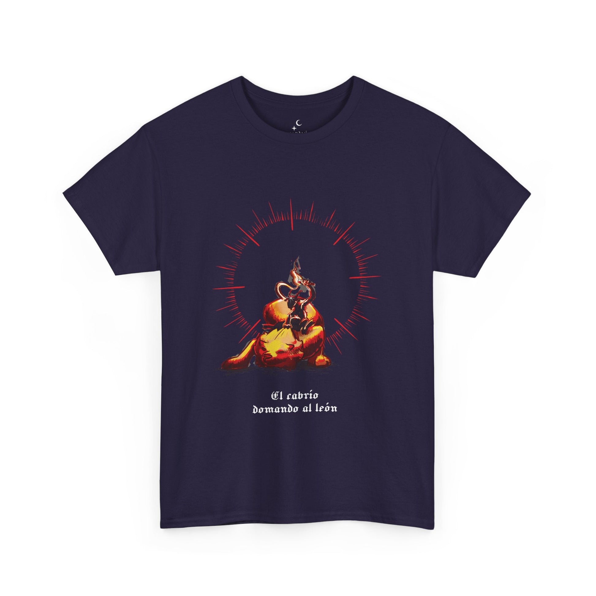 Esta escena mística representa a un cabrío dominando al león —no con fuerza, sino con puro fuego interior.